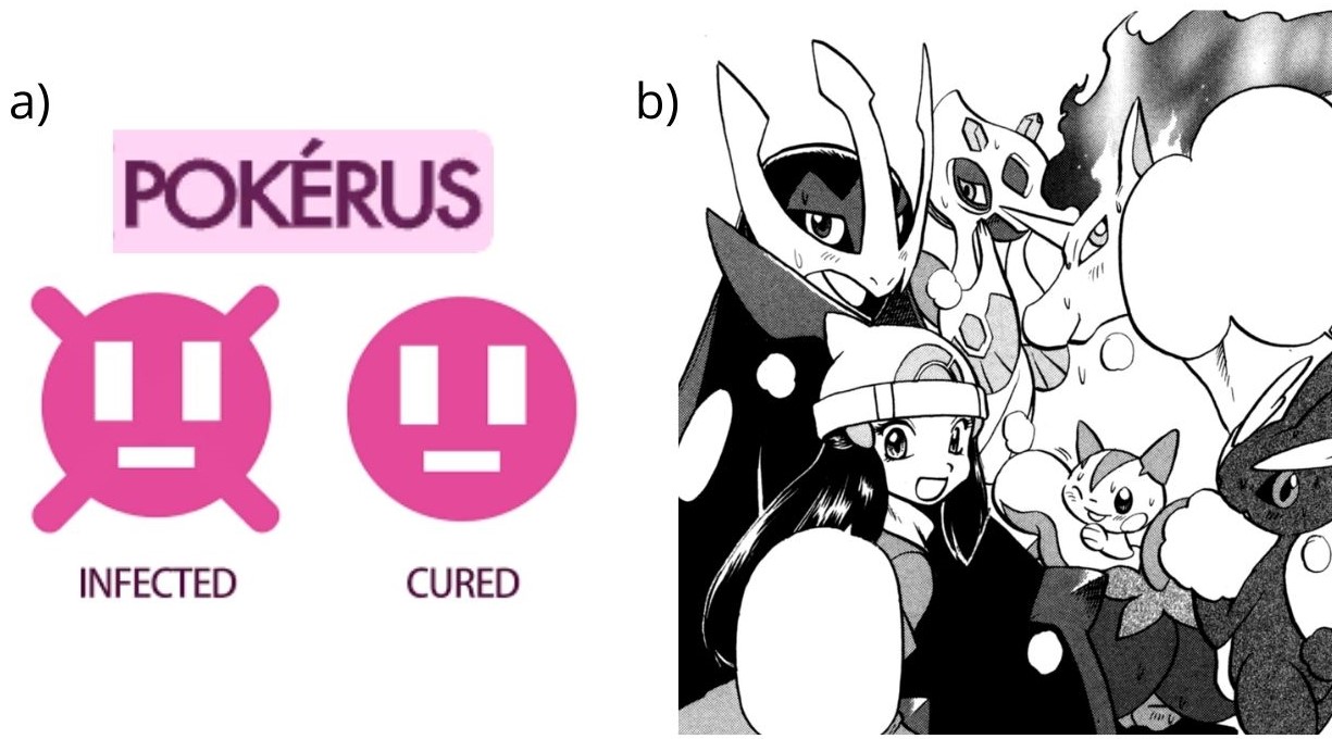 PKRS is a microscopic life-form that infects all Pokémon and spreads through direct contact between an infected and a healthy Pokémon, including eggs, within the same party. The infection lasts between one and four days, depending on the strain. Little is known about PKRS symptoms. In the video games, the infection appears asymptomatic, with affected Pokémon displaying only an icon on their info card (Fig. 1a). In the manga, however, infected Pokémon exhibit fever-like symptoms, such as sweating and facial rubor (Fig. 1b). This variability mirrors real-world infections like Influenza and COVID-19, which can range from asymptomatic cases to severe illness, though unlike these diseases, PKRS is never fatal (Shaikh et al., 2023).
