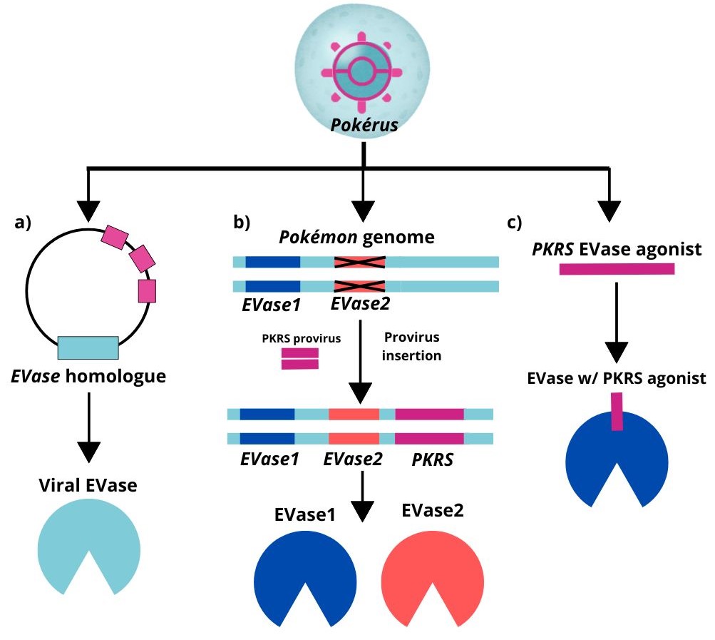 If PKRS is so beneficial to Pokémon, why hasn’t it become a permanent feature of their biology—perhaps even integrated into the Pokémon’s genome over time? Processes such as endogenization could allow PKRS to integrate with the host’s DNA. A good example of this process is found in parasitoid wasps, which inject their eggs into a host along with virus-like structures produced from endogenous viral elements (EVEs) (Guinet et al., 2023). These viral elements help dampen the host’s immune system, facilitating the development of the insect (Guinet et al., 2023). A closer example can be seen in Syncytin-1, a protein that developed from endogenous retroviruses and is essential for forming the syncytiotrophoblast, a tissue that separates maternal and fetal bloodstreams in the placenta (Chuong, 2018). However, for this process of viral domestication to occur, two key factors are required: a long time span and persistent selection pressure (Holmes, 2008).