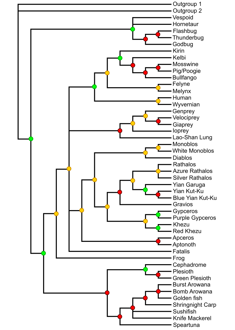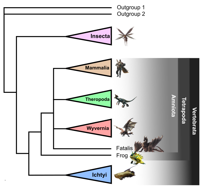 This article is an attempt to reconstruct a speculative phylogenetic tree by using Cladistics, observing the external anatomy of monsters. The topology of the tree will be discussed in this article. The bestiary of Monster Hunter lore contains hundreds of species presented as huntable creatures, but also items coming from fishing, insect harvesting and farming. However, cladistic is inappropriate for such a sizeable of data set (Darlu & Tassy, 1993). Thus, I only studied taxa from the first generation of Monster Hunter games, which are Monster Hunter (2004), Monster Hunter G (2005), and Monster Hunter Freedom (2005).
