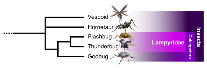 Vespoid has a social behavior evoking hymenopterans. Hornetaur, by having strong jumping legs and wings overlapping the abdomen at rest, looks like orthopterans such as locusts, grasshoppers, and crickets. Flashbug, Thunderbug and Godbug formed by the occurrence of moniliform antennas and the presence of elytra, modified hardened forewings distinctive of the order Coleoptera. To conclude, Flashbug and Thunderbug also share a bioluminescent abdomen, similar to real-life fireflies from the lampyrid family.