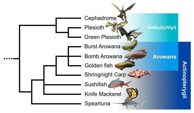 This clade is divided into two subunits. The first one groups Speartuna, Knife Mackerel, Shringnight carp and the family the Arowana species. All of them are closely based on real animals. They all possess ray fins, a characteristic of the real-world actinopterygian clade. The occurrence of premaxillary mobility allows us to refine the comparison with the Teleostei (Betancur-R et al., 2013).