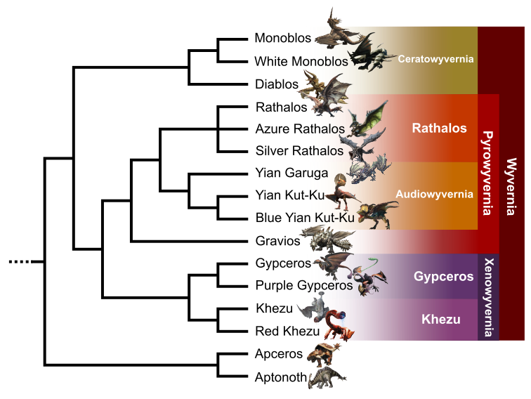 Gravios, Yian Kut-Ku, Yian Garuga, Rathalos and their subspecies form a clade that I called Pyrowyvernia, referring to the pressurized organ containing a flammable substance used for hunting or defense. With the exception of Gravios, all of the others are carnivorous taxa. During their hypothetical evolution, they developed different morphological traits in that sense. Yian Garuga, Yian Kut-Ku and Rathalos subspecies have an anisodactyl foot selected to catch prey. They also possess a bony sting at the tip of the tail. This bone is hollow with a canal connected to a venom gland. This organ was, however, lost during the evolution of the group and is absent in Yian Kut-Ku and Blue Yian Kut-Ku, where only an atrophied bony sting remains. Yian Garuga, Yian Kut-Ku and Rathalos subspecies also develop efficient hearing, with the occurrence of a scale transformed in an auricle-like structure, convergent to the outer ear of mammals. This adaptation was further selected upon, with the apparition in Yian Garuga and Yian Kut-Ku of large, parabolic, somital and mobile ears to locate prey by sound. We choose to name this clade Audiowyvernia (“hearing wyverns”).