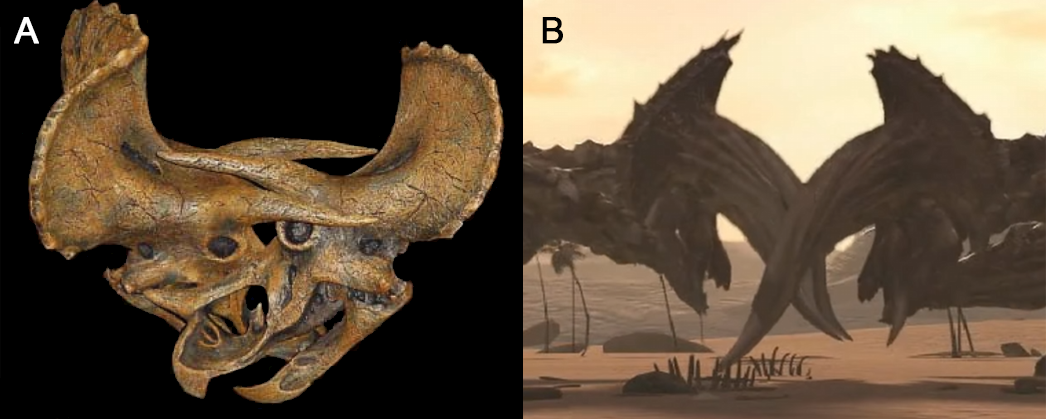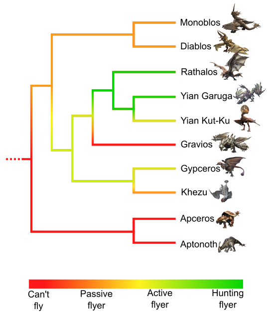 In the case of wyverns, the taxa from the first Monster Hunter games are heavy creatures, from hundred kilograms to several tons. The “Arboreal model” cannot be used to explain the emergence of flight; Monoblos and Diablos weigh several tons, so no tree could sustain that. The “Pouncing model”, from an ambush predator ancestor jumping from higher ground, is unlikely. The external group to wyverns, Apceros and Aptonoth, are herbivorous, as are the most basal wyverns, Diablos and Monoblos. Thus, the “Cursorial model” seems to be the most plausible; with the exception of Khezu, all wyverns are good runners, so it is possible that the origin of flight lies in this behavior. Studying other wyverns from more recent games, including the smaller ones, should allow us to confront this hypothesis and better understand the emergence of flight in the wyvern clade.